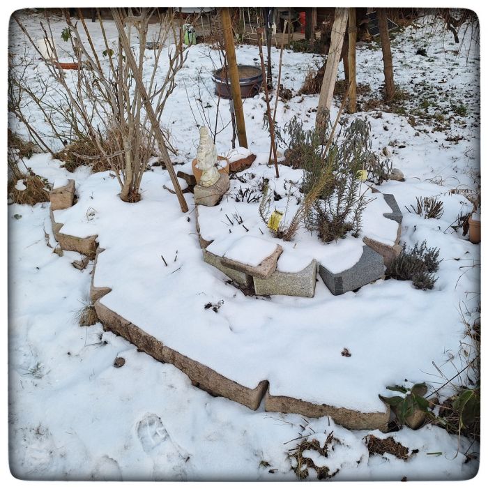 Im Winter sieht der Kräuterhügel genau so aus, wie der Rest des Gartens, triest und trostlos. So ist das.